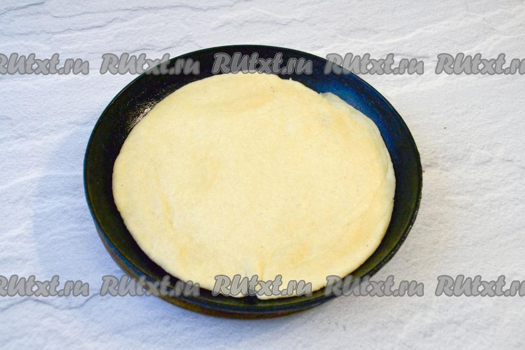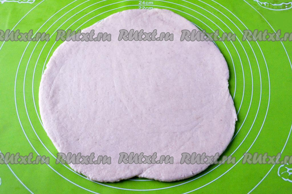 Поставьте рулет вертикально, расплющите сначала руками, затем раскатайте скалкой в лепёшку, диаметр которой должен быть равен диаметру сковороды, на которой будете жарить лепёшку. Таким же способом подготовьте вторую лепёшку из оставшегося теста.