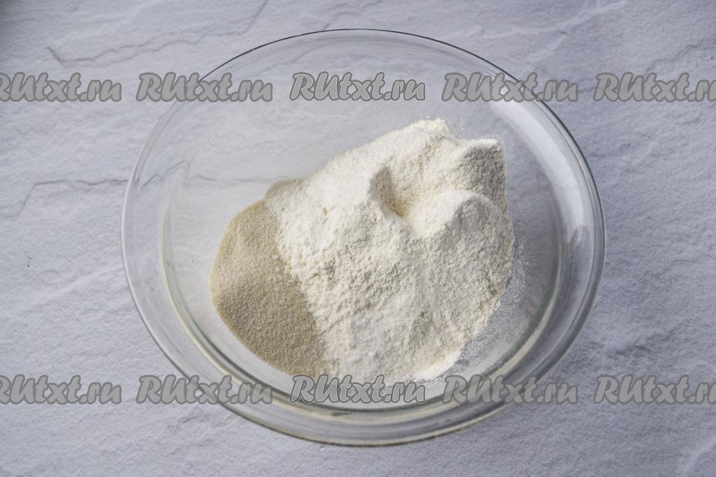 В глубокую миску просейте муку, всыпьте манку, сахар, соль и разрыхлитель, перемешайте.