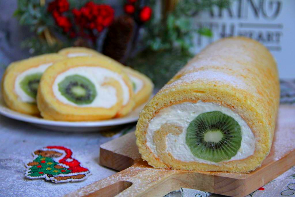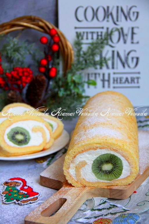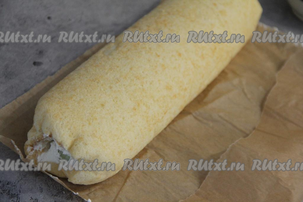 Завернуть корж с кремом и киви в плотный рулет, начиная со стороны, ближе к которому лежат киви, и помогая при сворачивании ковриком (или пергаментом), на котором выпекали бисквит.