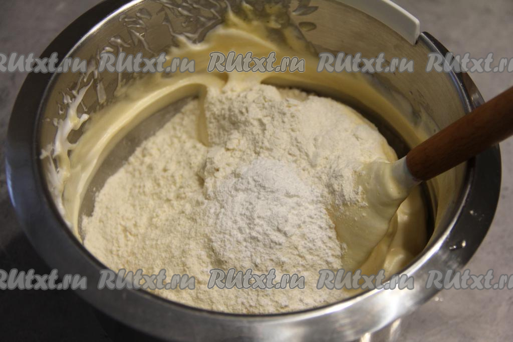 Влить молоко и растопленное сливочное масло в смесь белков и желтков, перемешать лопаткой. Масса должна остаться воздушной. Всыпать просеянную муку и разрыхлитель, аккуратно вмешать в бисквитное тесто.