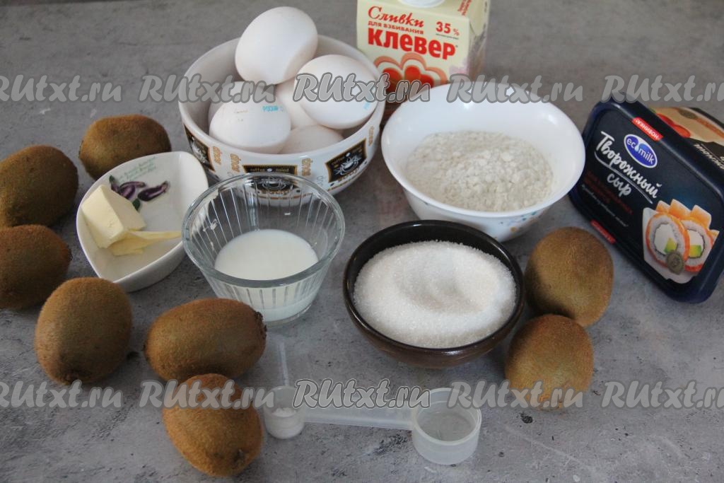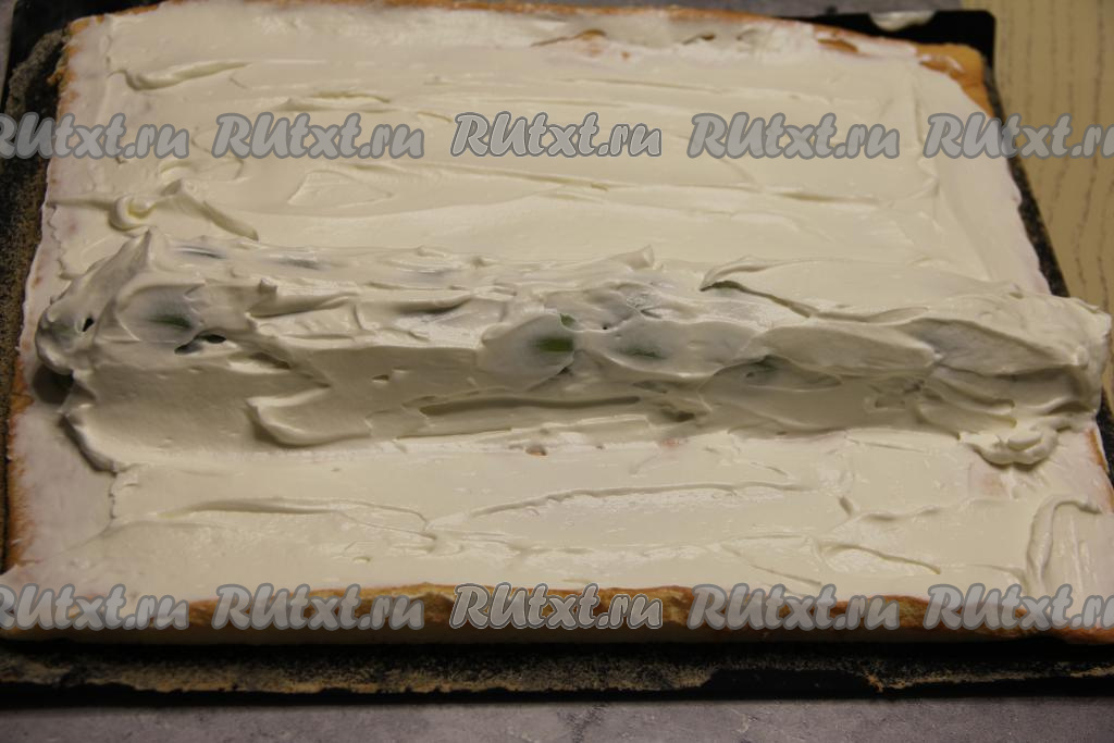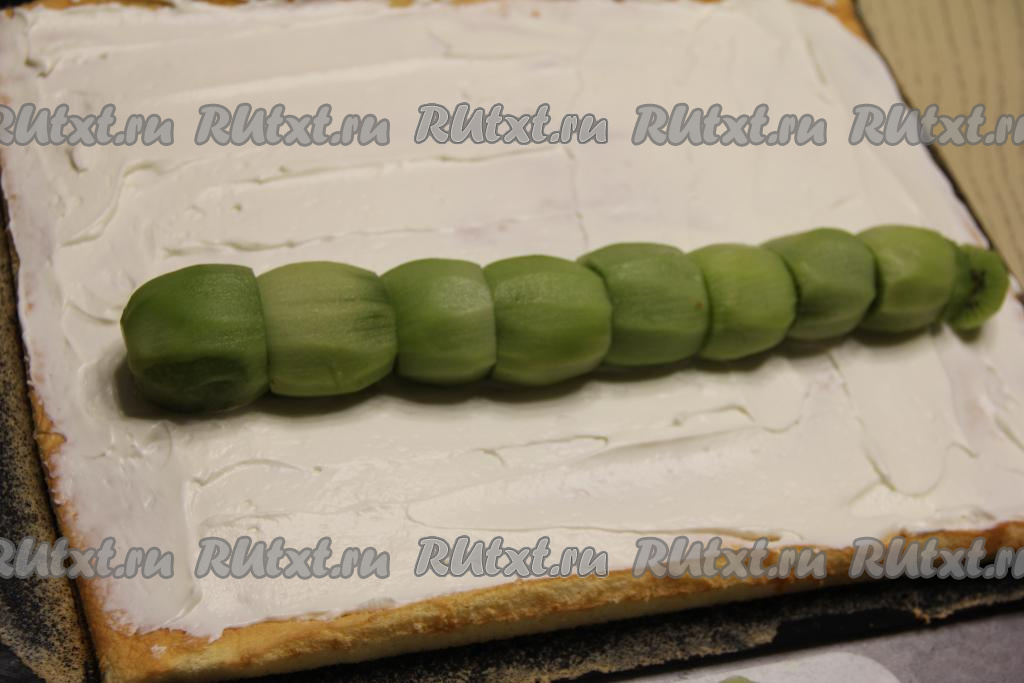 Выложить киви на корж с кремом, отступив 10 сантиметров от длинного края.