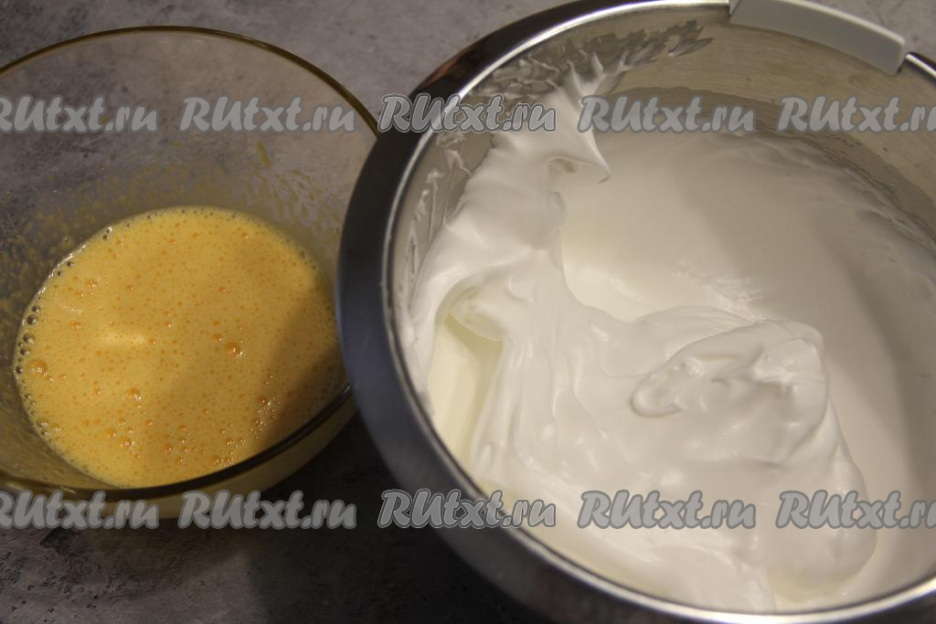 Добавить во взбитые белки желтковую массу, перемешать аккуратно лопаткой до однородности.