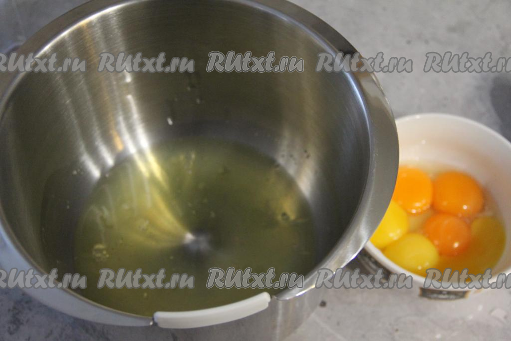 Яйца аккуратно разделить на белки и желтки. Белки поместить в чашу миксера.