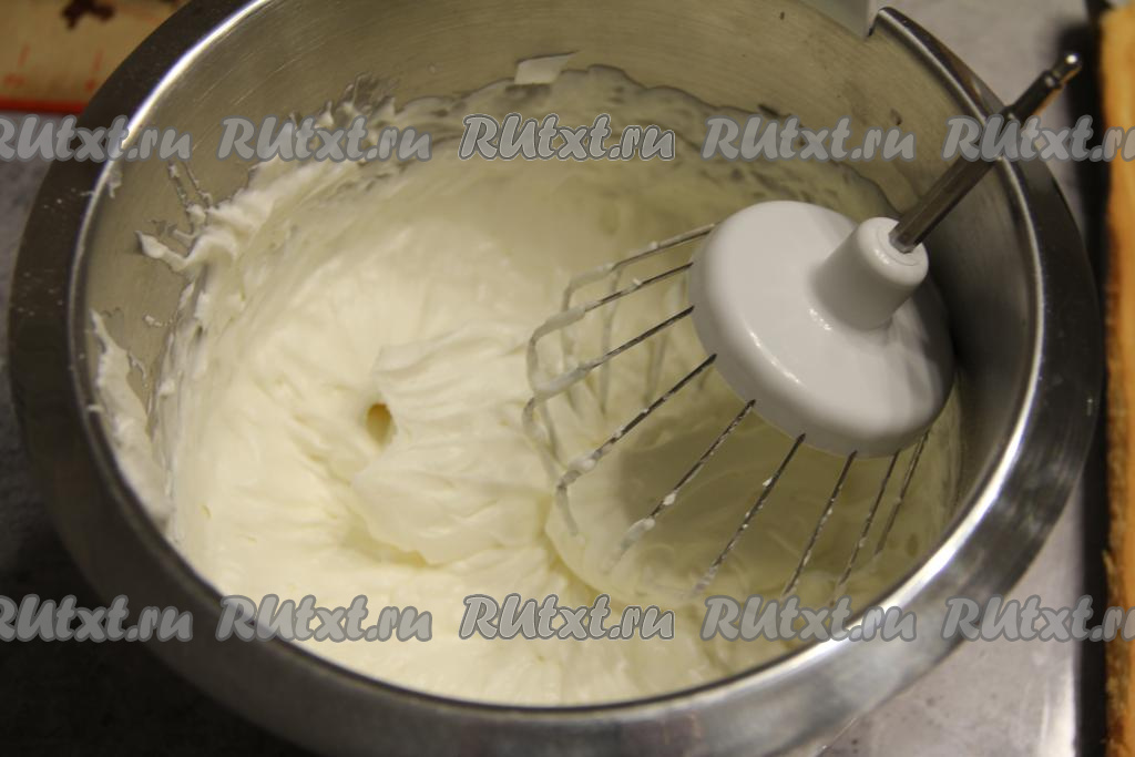 Теперь займёмся кремом. Сливки нужно хорошо охладить. Соединить сливки и сахарную пудру в ёмкости, удобной для взбивания, взбить миксером до мягких пиков, затем добавить творожный сыр и взбить до стойких пиков.