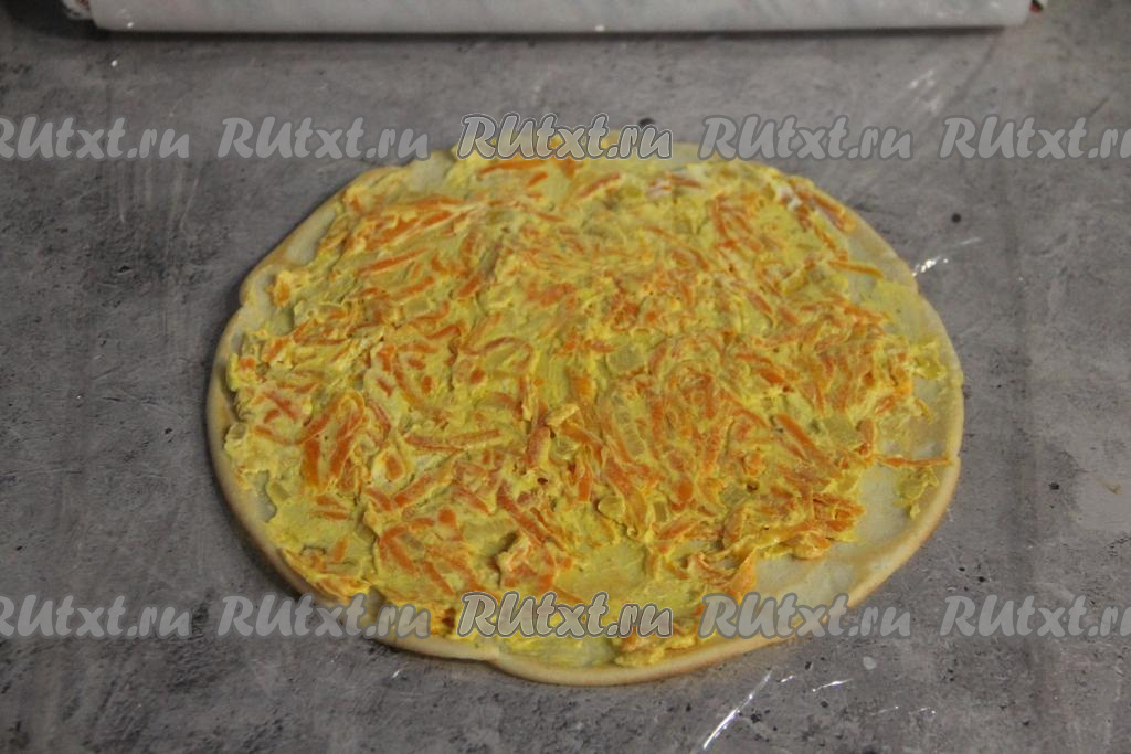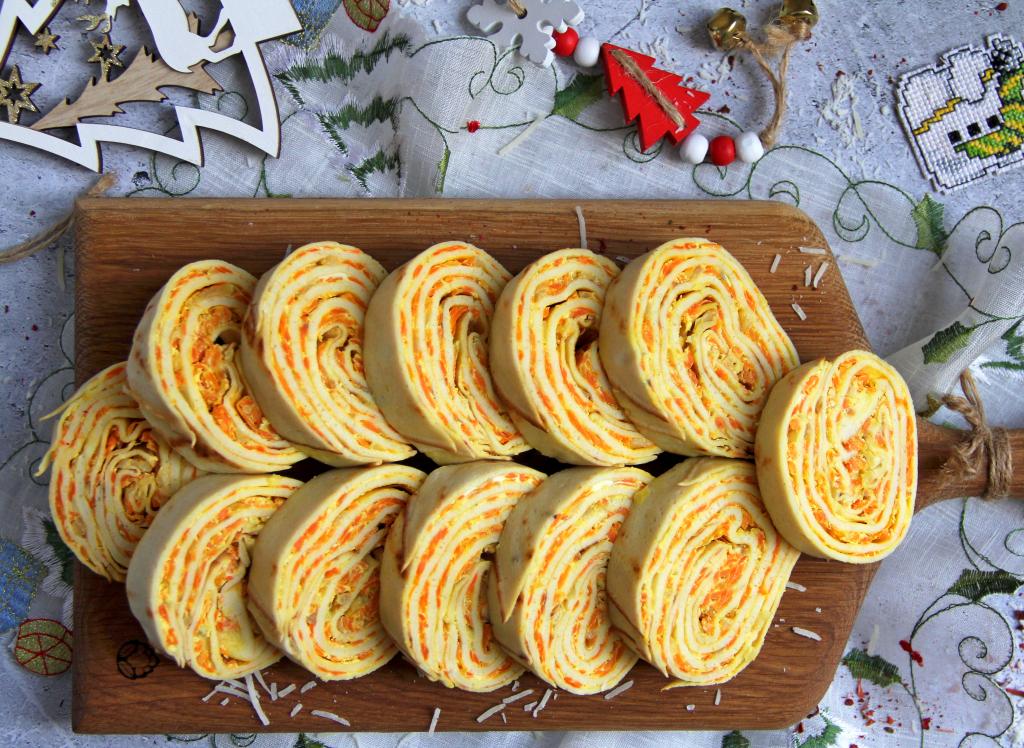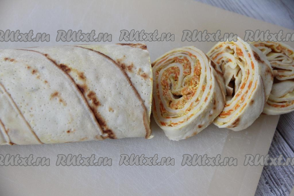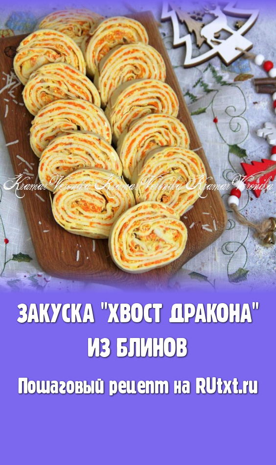 Уже многие хозяйки подбирают рецепты к наступающему Новому году, хозяином которого по восточному гороскопу будет Дракон. Предлагаю приготовить простую, эффектную и вкусную закуску "Хвост дракона". Формируется закуска из блинов, смазанных начинкой и сложенных внахлёст, а затем скрученных в рулет. В качестве начинки можно использовать овощи, курицу или ветчину. Я сделала начинку из жареных морковки с луком и творожного сыра. Такая сырно-овощная начинка сделала блюдо и красивым, и вкусным. Уверена, закуска "Хвост дракона" не останется незамеченной на новогоднем столе и понравится и вам, и вашим близким!