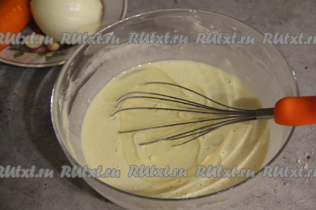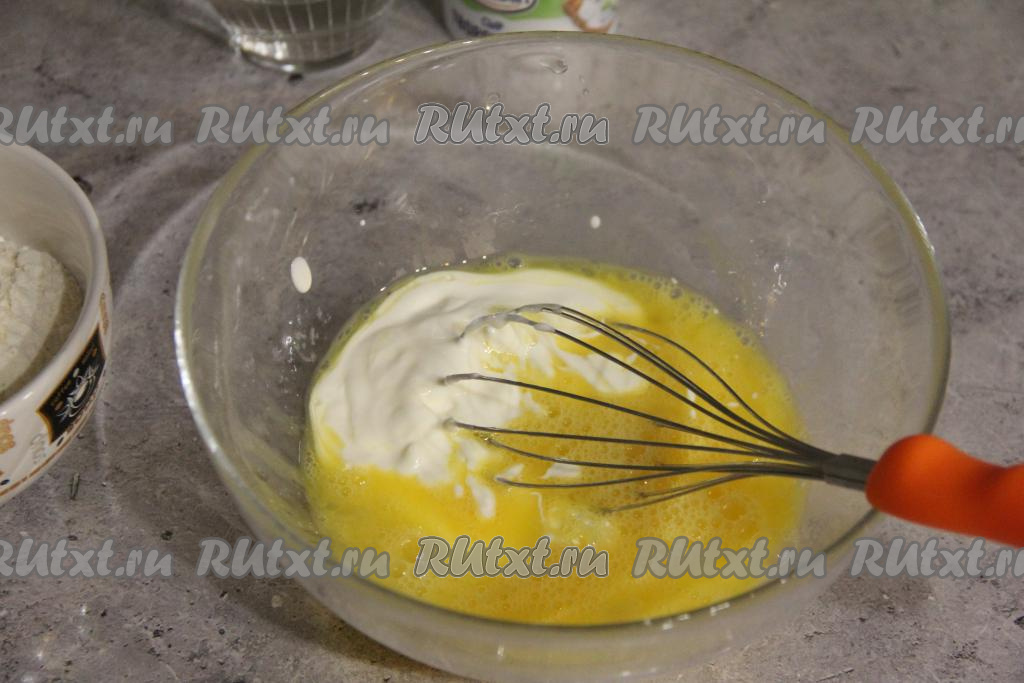 В получившуюся яично-сметанную смесь всыпать муку, перемешать блинное тесто венчиком.