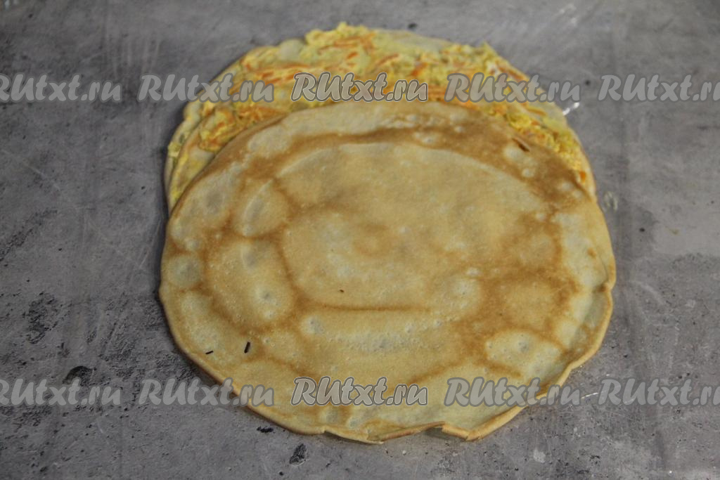 Таким образом сформировать полоску из блинов с начинкой. Подогнуть немного крайние блинчики.