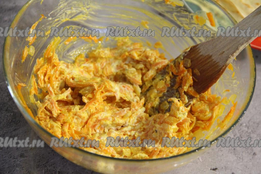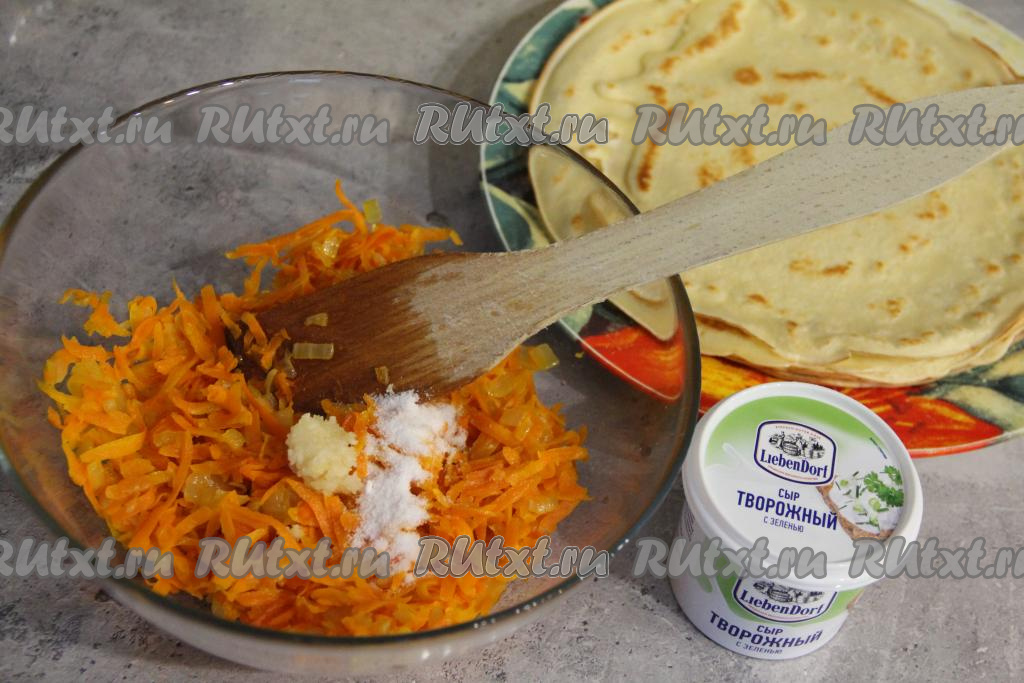 Жарить овощи до мягкости моркови (ориентировочно минут 12-15), иногда перемешивая. Жареные овощи переложить со сковороды в объёмную миску, дать им немного остыть, после этого добавить к ним соль и чеснок, пропущенный через пресс, перемешать.