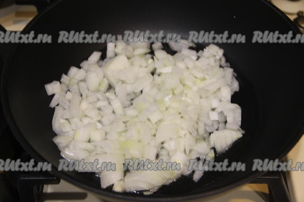 Теперь приготовим начинку. Для этого в сковороде нужно хорошо прогреть растительное масло, огонь уменьшить до среднего, выложить мелко нарезанный лук, обжарить его до прозрачности (на это потребуется минут 5), периодически перемешивая.