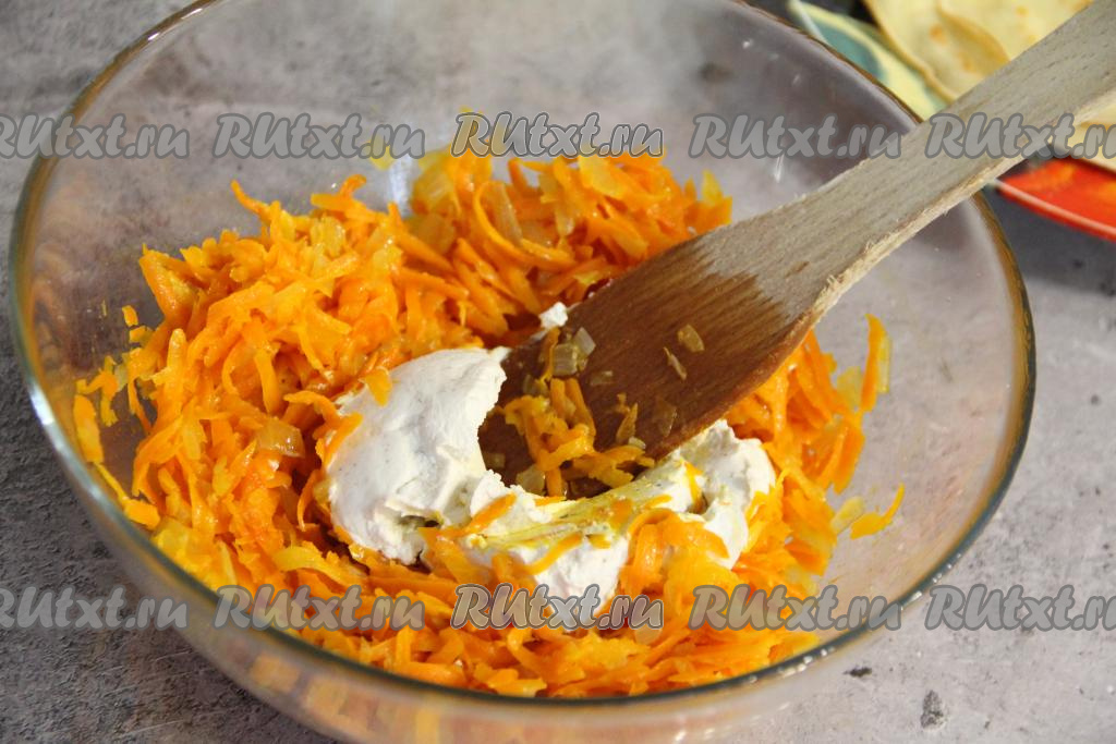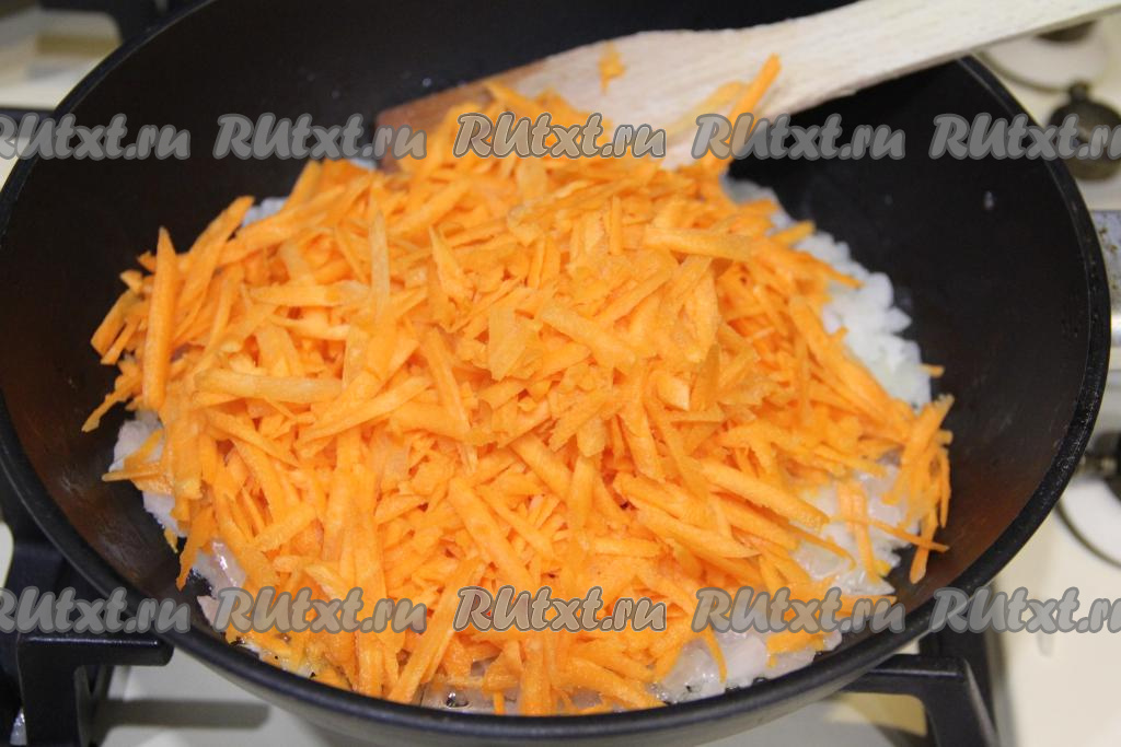 Натереть на крупной тёрке обе морковки и выложить к обжаренному луку, перемешать овощи.