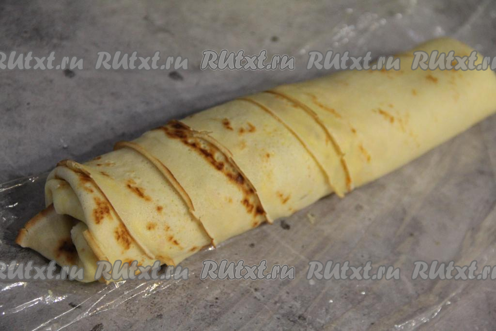 Свернуть блины с начинкой в плотный рулет, начиная с широкой стороны полоски из блинов.
