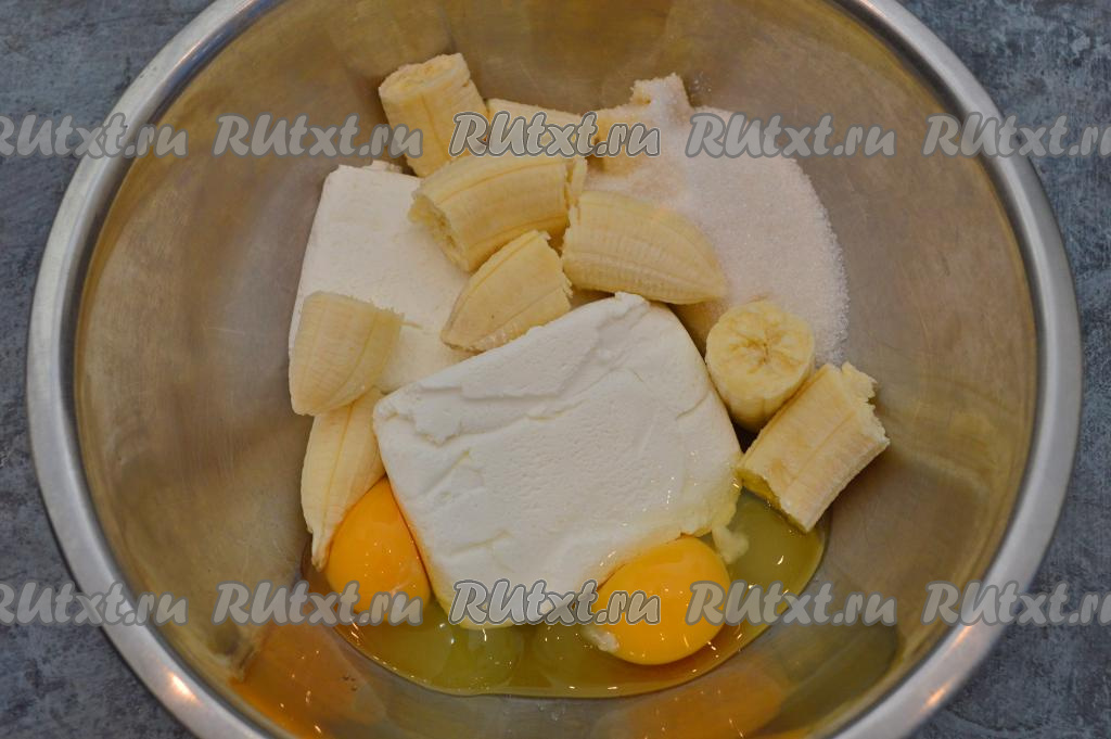 В глубокую миску выложить творог и очищенные от шкурки бананы, разломанные на кусочки, всыпать сахар и вбить сырые яйца.