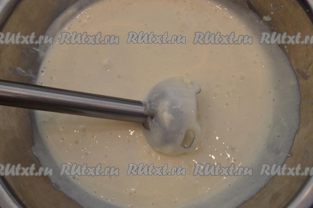 При помощи погружного блендера пробить творожно-банановую массу до однородности (я взбивала примерно в течение 2 минут). Если есть измельчитель, то можно пробить творог с бананами, яйцами и сахаром в нём.