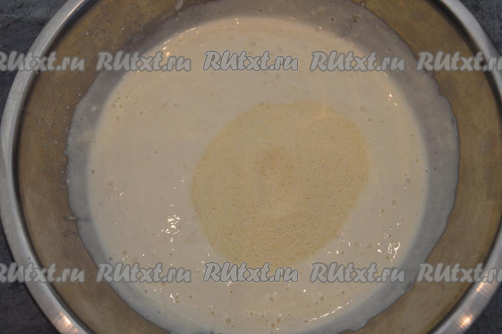 В творожно-банановую массу всыпать манку, перемешать венчиком. Возможно, в творожно-банановой массе после взбивания останутся несколько мелких комочков творога или банана, их можно растереть венчиком в процессе вмешивания манки. Оставить творожно-банановое тесто отдохнуть на 5-10 минут, чтобы манка немного набухла. Тесто получится однородным и в меру густым.