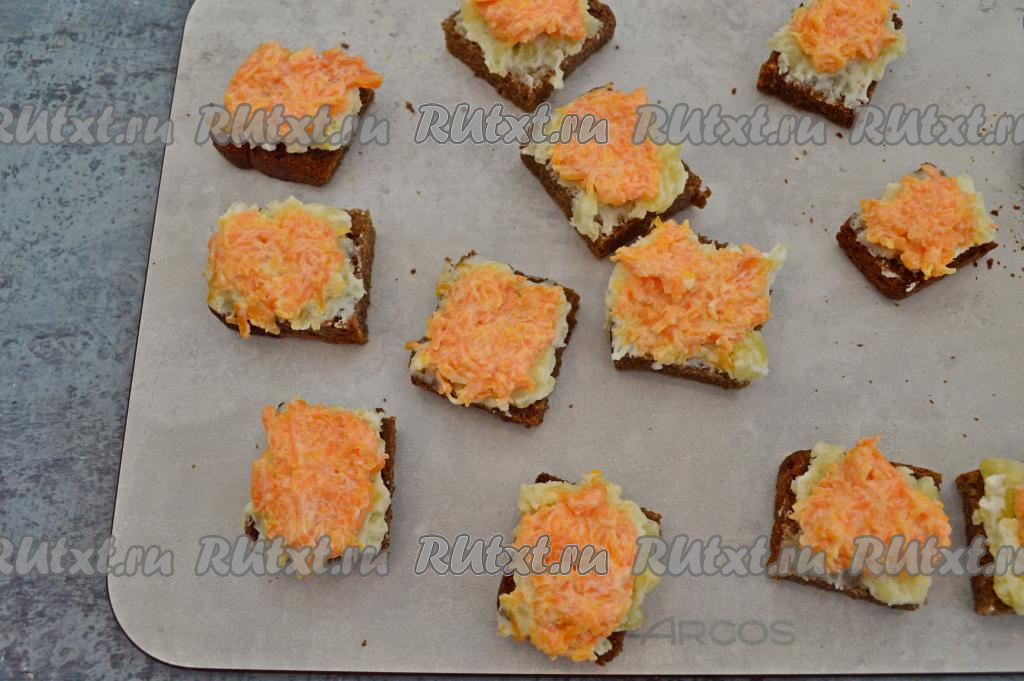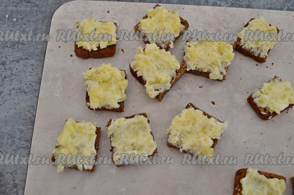 Теперь приступаем к сборке канапе "Селёдка под шубой". На подготовленные кусочки чёрного хлеба выкладываем по чайной ложке картошки.