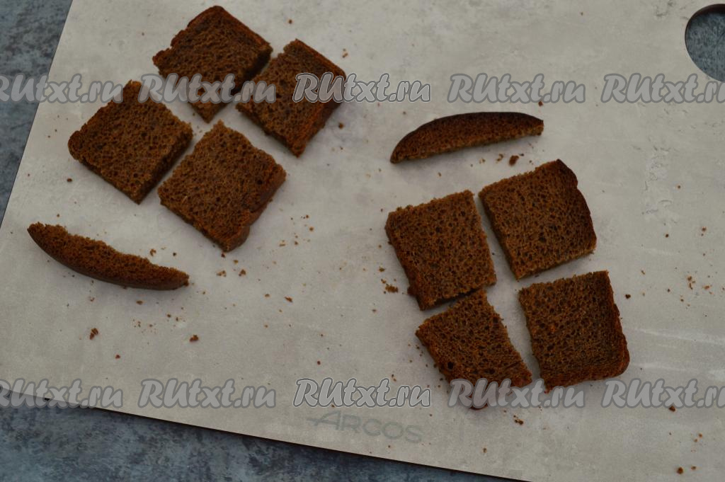 Каждый ломтик хлеба разрезать на 4 части. Корочку срезать, она нам не понадобится.