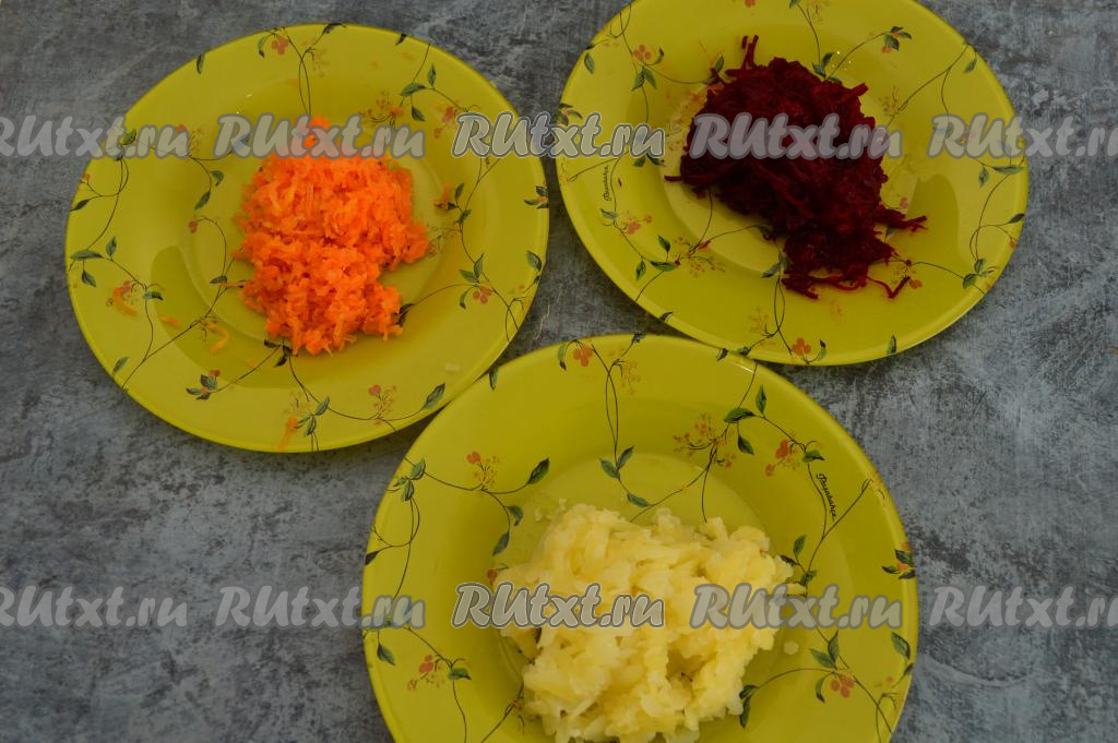 Очистить картошку, морковку и свеклу. Картошку натереть на крупной тёрке, а морковку и свеклу - на средней тёрке.