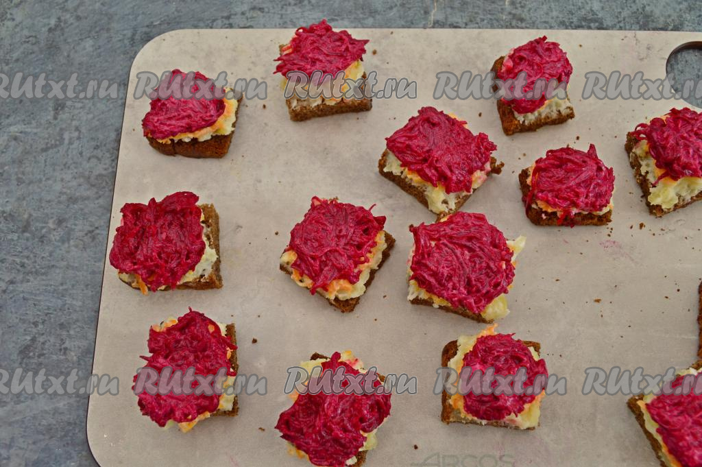 Третьим слоем чистой чайной ложкой аккуратно выкладываем слой свеклы (свеклы я тоже вкладываю на каждое канапе по чайной ложке).
