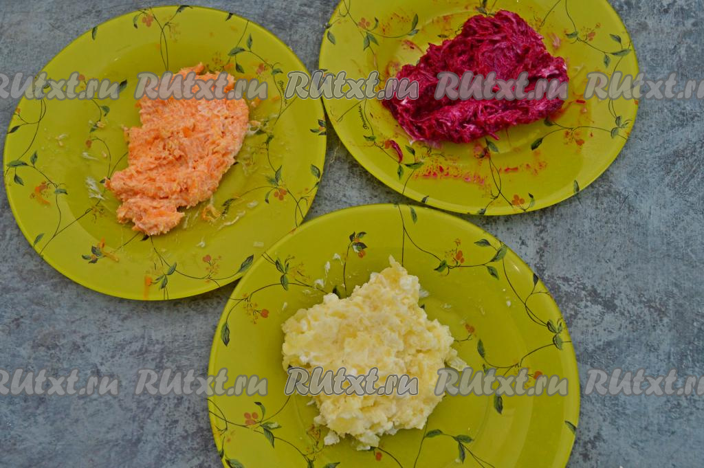 Смешать отдельно морковку, свеклу и картошку с небольшим количеством майонеза.