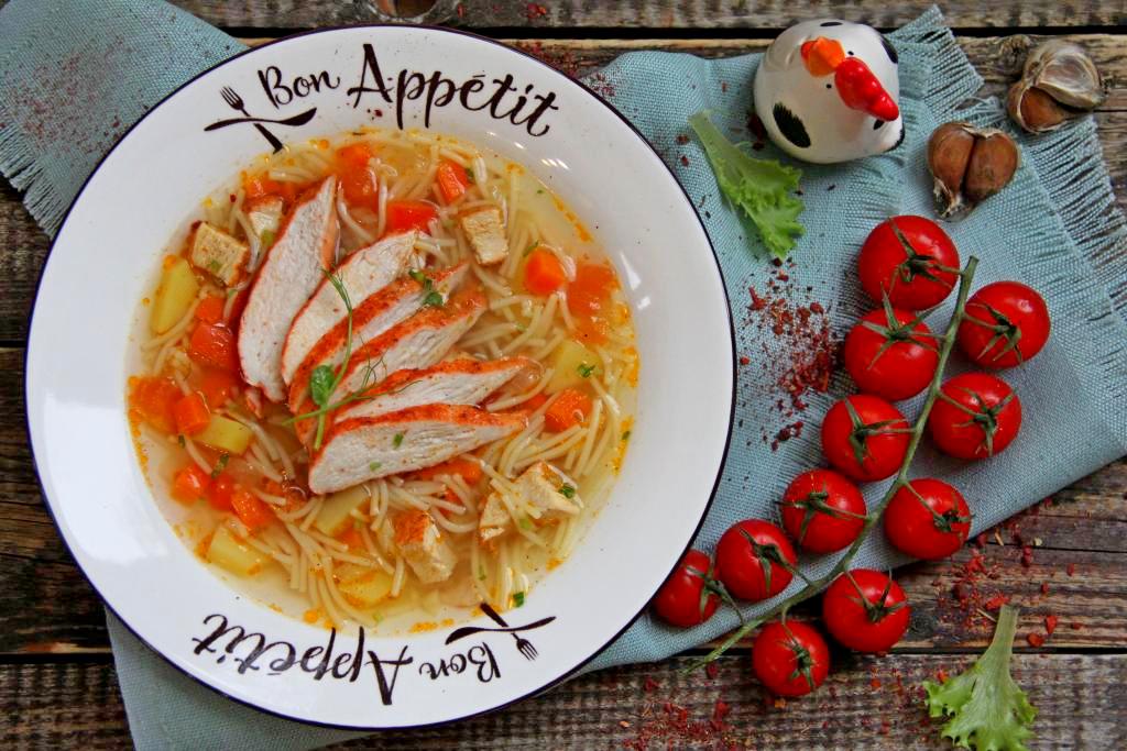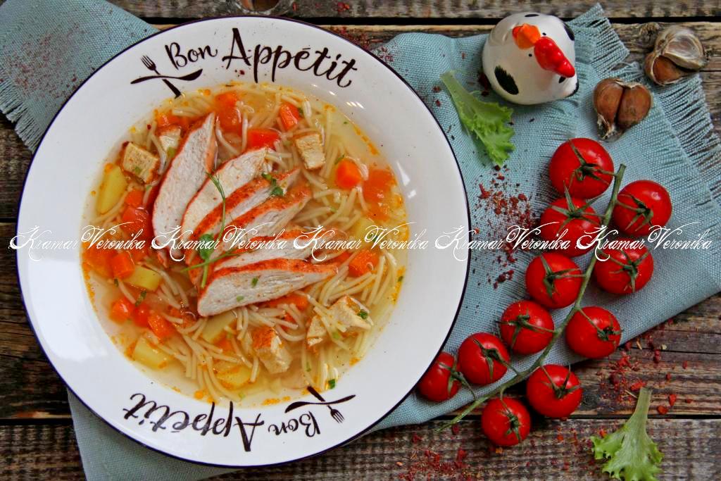 Недавно сварила аппетитный, вкусный, ароматный суп с жареной курицей. Блюдо понравилось всей семье. Куриное филе предварительно обжаривается в кастрюле с толстым дном, а потом в этой же кастрюле варится суп. Рецепт достаточно простой, а блюдо получается насыщенным и аппетитным. С составом овощей можете экспериментировать, например, если нет болгарского перца - можно обойтись и без него. При подаче суп можно дополнить рубленной зеленью.