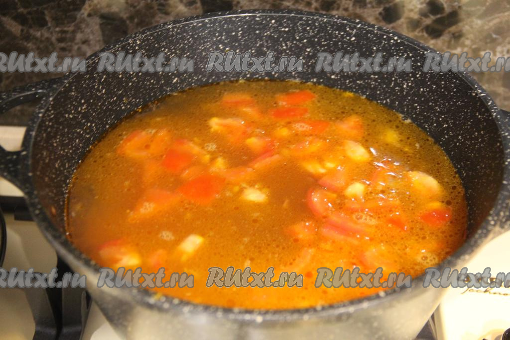 В кастрюлю с обжаренными овощами влить 2 литра кипящей воды, добавить нарезанные картофель и куриное мясо, довести суп до кипения и варить на медленном огне 10-15 минут (до мягкости картофеля).