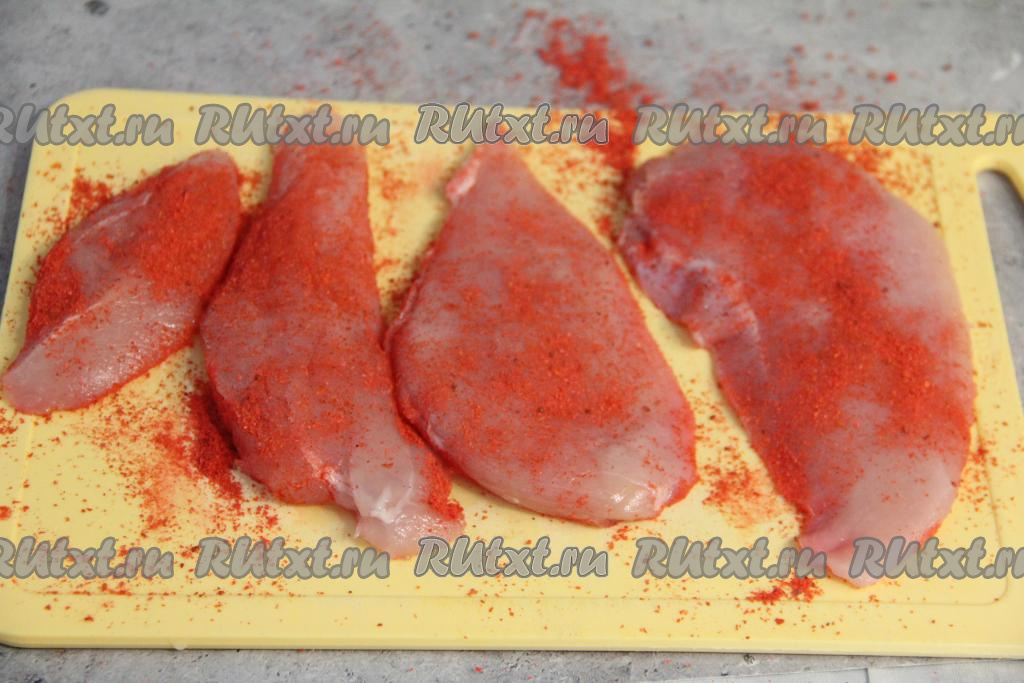 Куриное филе вымыть, обсушить. Разрезать каждой филе вдоль на несколько частей. Посолить куриное мясо и посыпать специями со всех сторон (я посыпала паприкой).
