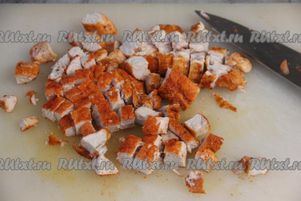 Часть жареной курицы отложить в сторону для подачи. А оставшееся мясо нарезать на кубики.