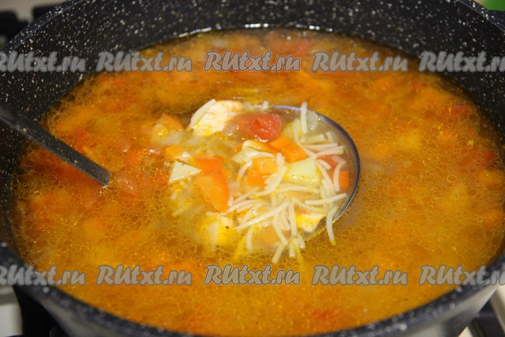 Суп с жареной курицей и овощами посолить по вкусу, всыпать вермишель, добавить чеснок, дать закипеть на достаточно сильном огне, уменьшить огонь до минимума и проварить 3 минуты, накрыть кастрюлю крышкой и снять с огня. Оставить суп настояться на 10 минут.