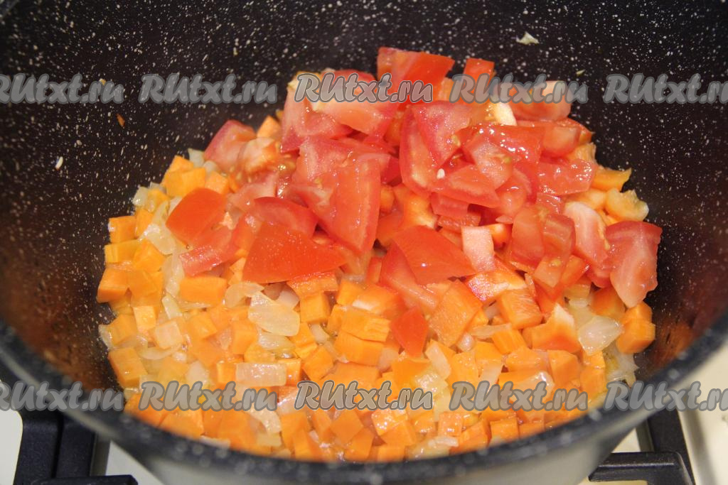 К обжаренным овощам добавить нарезанные перец и помидоры, сразу перемешать и обжаривать 3-4 минуты.