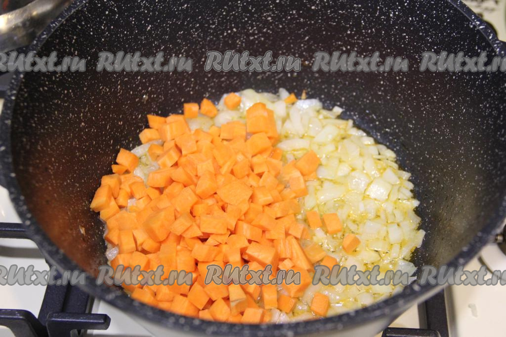 Затем к луку добавить очищенную морковку, нарезанную на мелкие кубики, перемешать овощи и обжаривать их 4-5 минут, иногда помешивая.