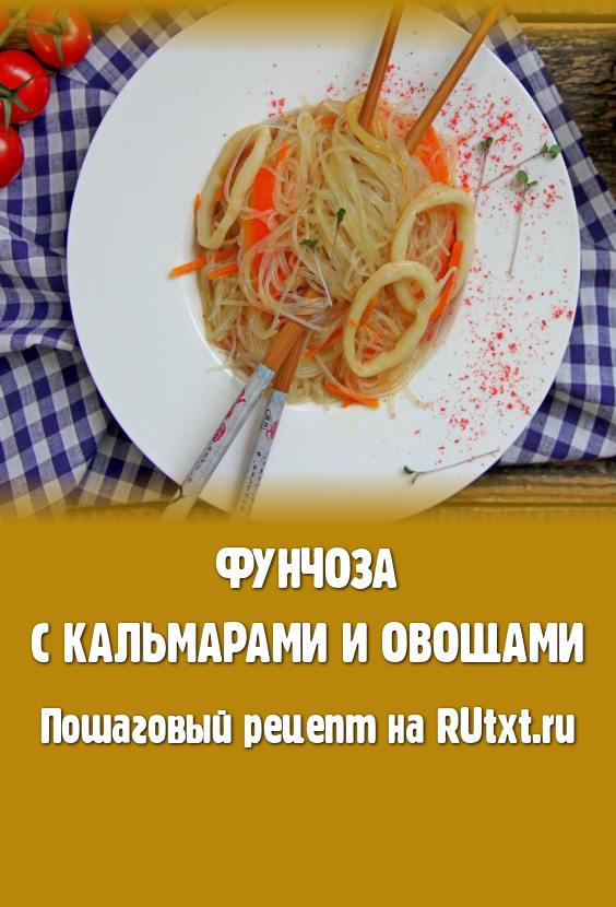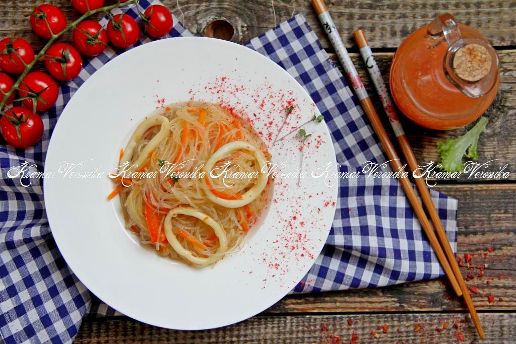 Разложить горячую фунчозу с кальмарами и овощами по тарелкам и подать аппетитное, очень вкусное, пикантное и сытное блюдо к столу.