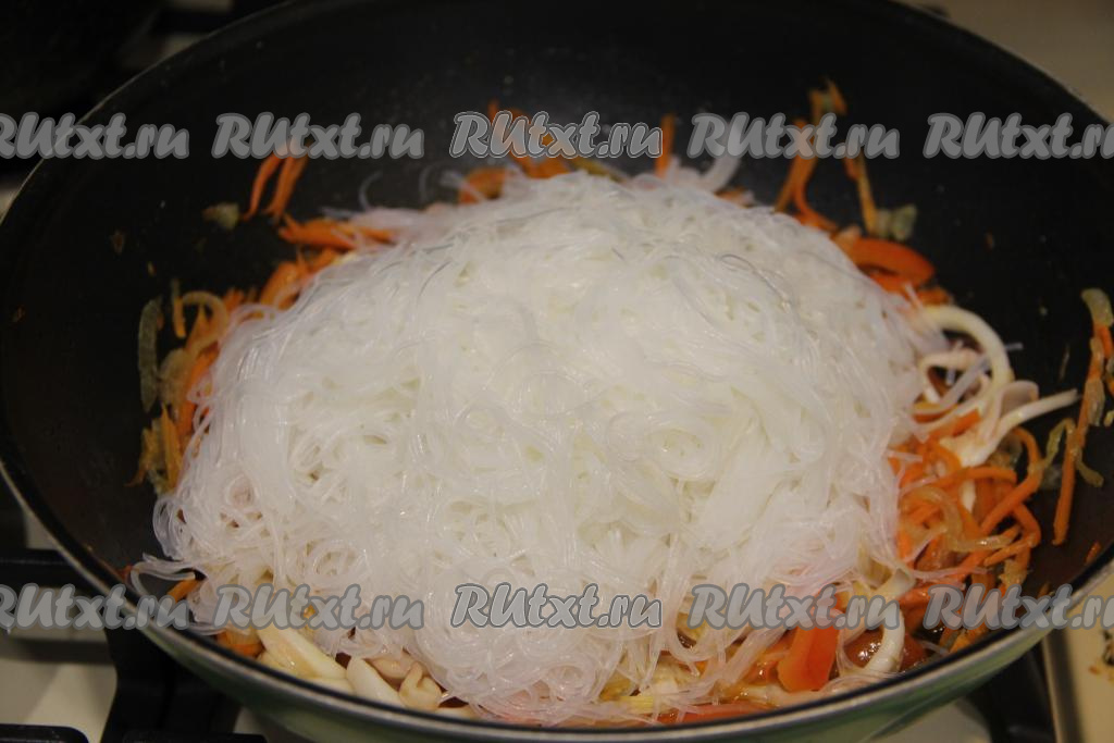 Затем добавить фунчозу, влить соевый соус.