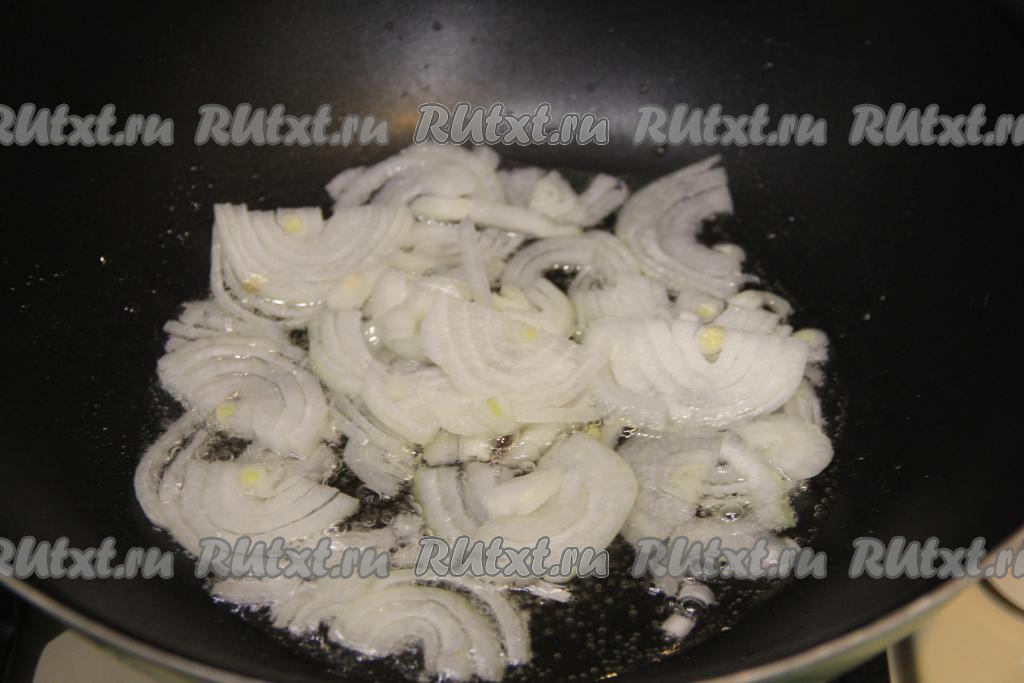 Одновременно с подготовкой фунчозы, можно заняться обжаркой овощей. Для этого в сковороду с высокими бортиками (или в сковороду вок) нужно влить растительное масло, разогреть его и выложить лук, нарезанный на полукольца. Обжарить лук до прозрачности (в течение 3-4 минут), иногда перемешивая, на среднем огне.