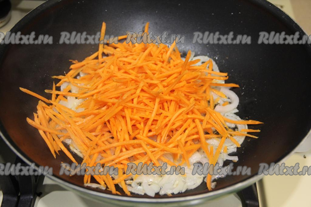 К луку, обжаренному до прозрачности, выложить морковку, натёртую на тёрке для моркови по-корейски (или на обычной крупной тёрке), перемешать и обжарить до мягкости моркови (минут 5), время от времени помешивая.