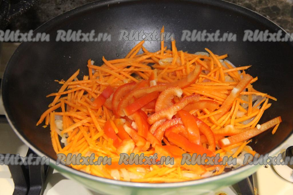 К обжаренным овощам выложить болгарский перец, нарезанный на длинные полоски, перемешать, обжаривать овощи минут 5, не забывая их иногда перемешивать.