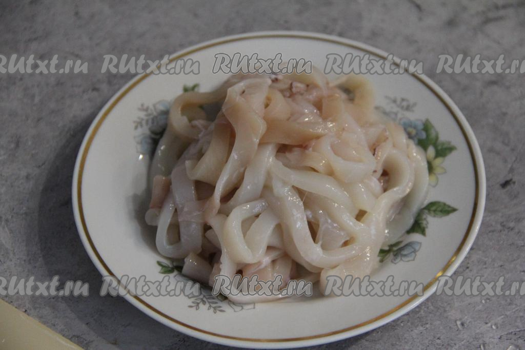 Очищенные кальмары нарезать на тонкие колечки.