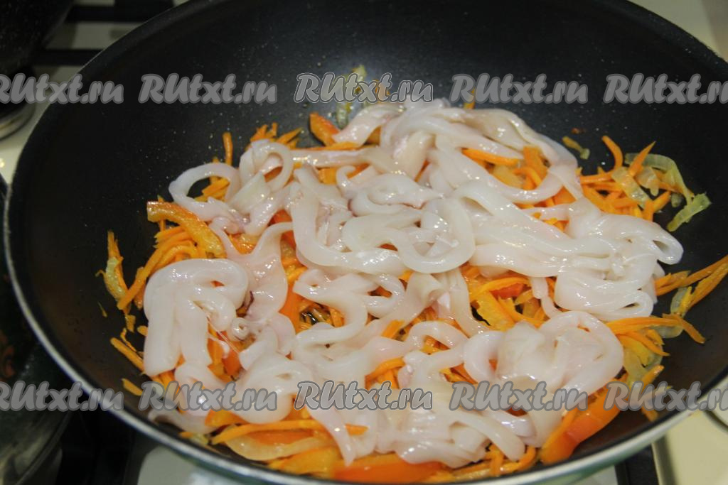 Выложить кальмары в сковороду с обжаренными овощами, перемешать.