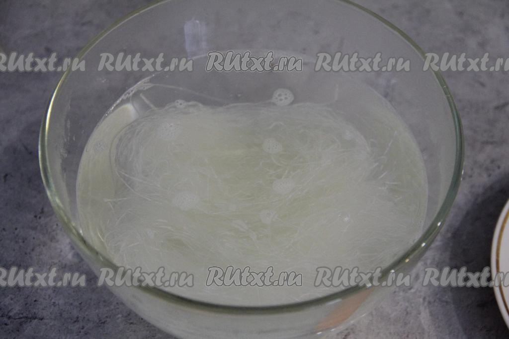 Фунчозу переложить в глубокую миску, залить полностью кипящей водой и оставить на 5 минут.