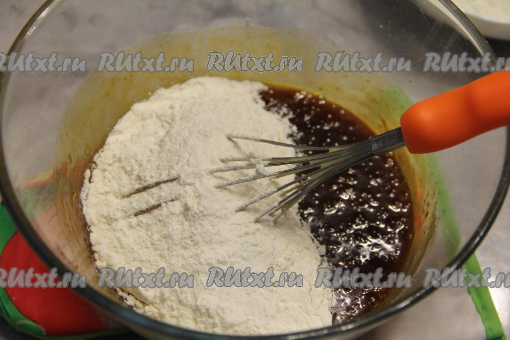Всыпать муку в несколько приёмов, постоянно перемешивая тесто венчиком, а затем вымесить тесто для пряников руками.