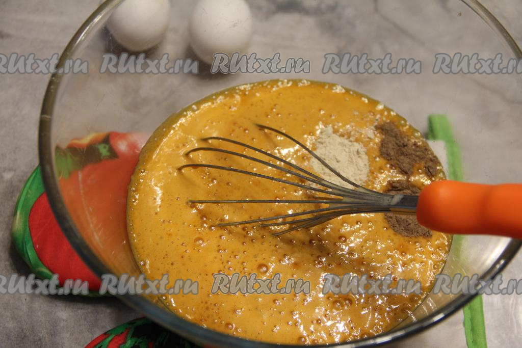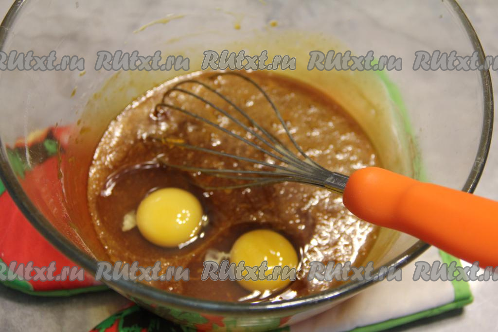 Затем добавить сырые яйца и вмешать их венчиком в тесто.