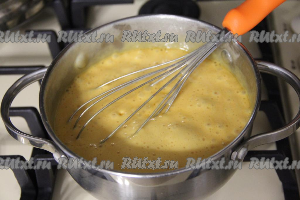 Поставить кастрюлю на огонь чуть ниже среднего и, постоянно помешивая венчиком, довести до кипения.