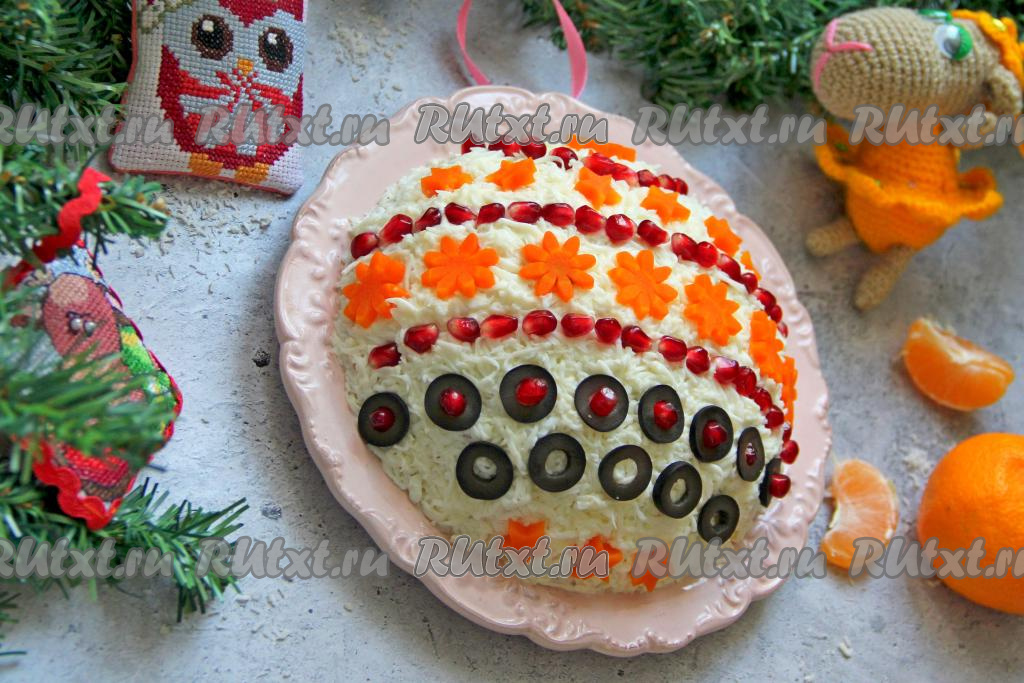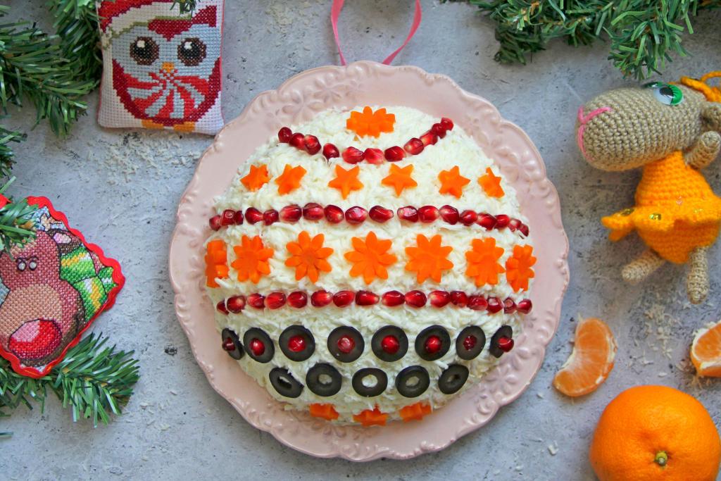 Из варёной морковки вырезать цветочки и разложить их на салате. Если сложно, то вместо цветочков можно вырезать звёздочки, квадратики или треугольники. Украсить салат зёрнами граната и нарезанными на кружочки маслинами.