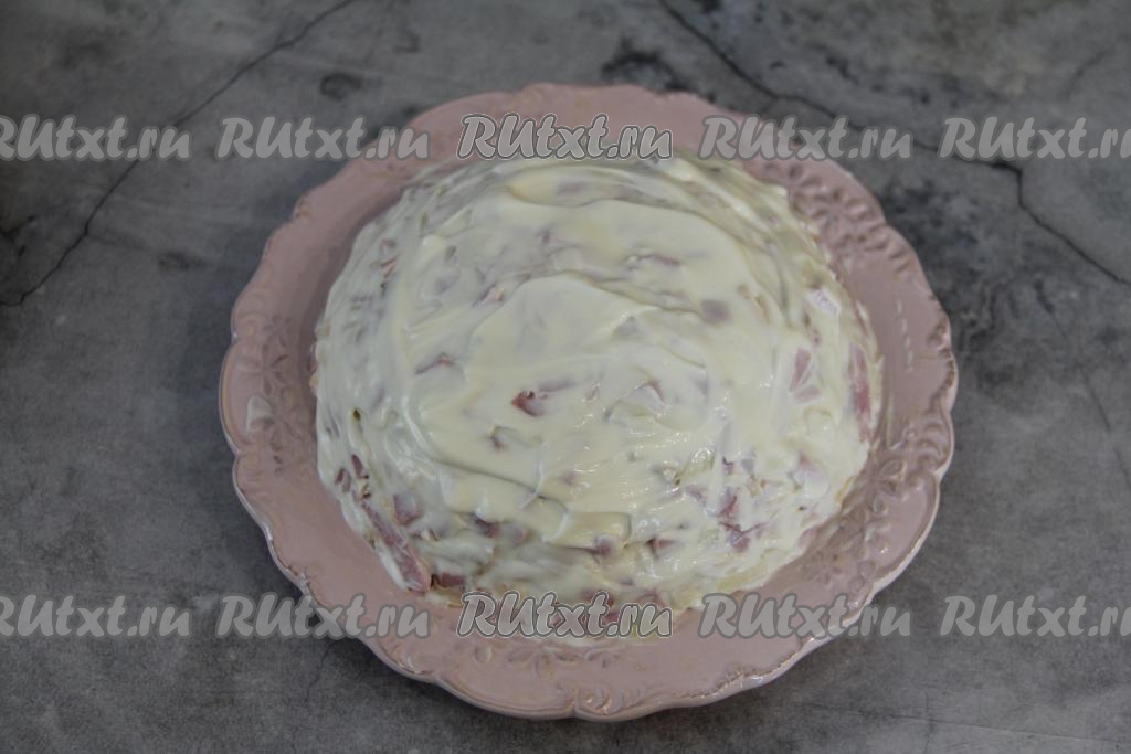 Выложить получившийся салат на тарелку, сформировав полусферу. Удобно формировать силиконовой лопаткой.
