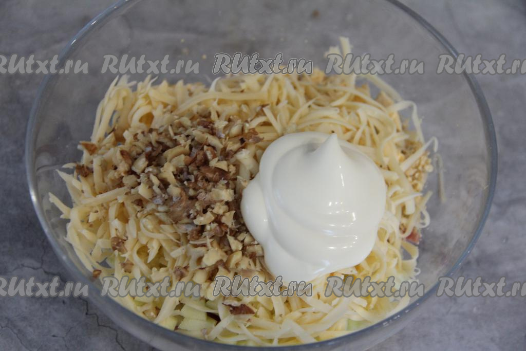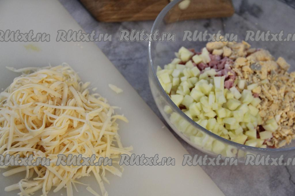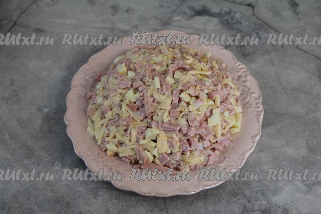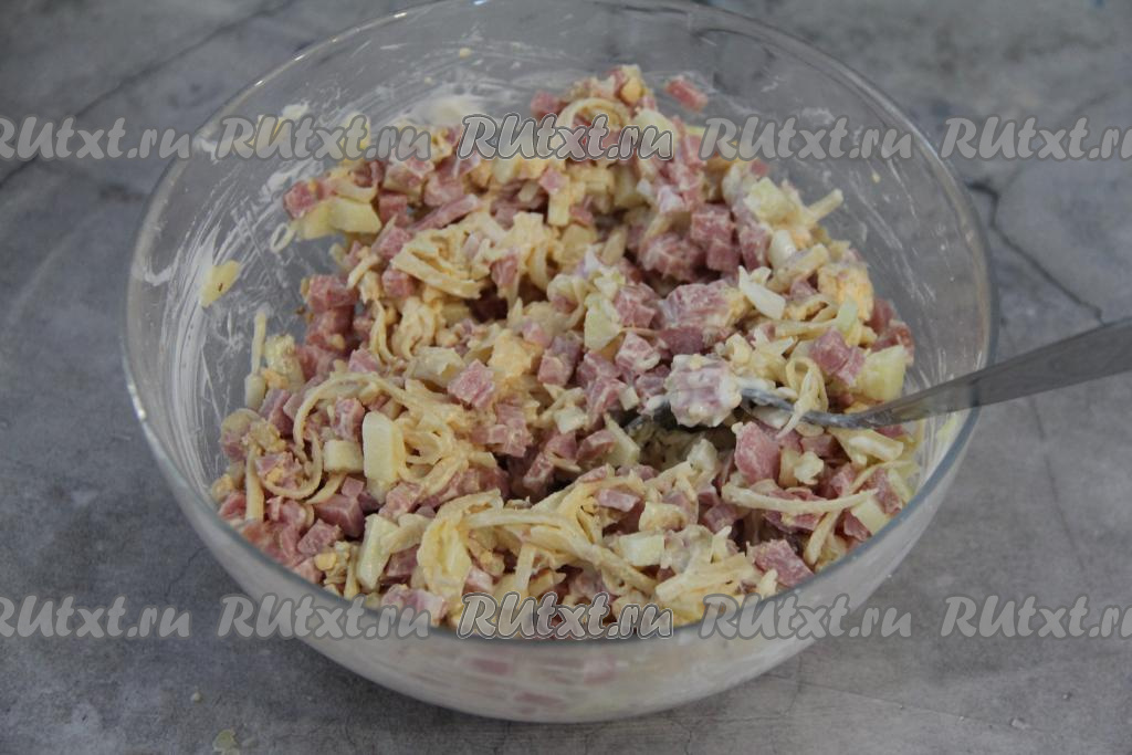 Перемешать салат из колбасы, сыра, яиц и яблока.