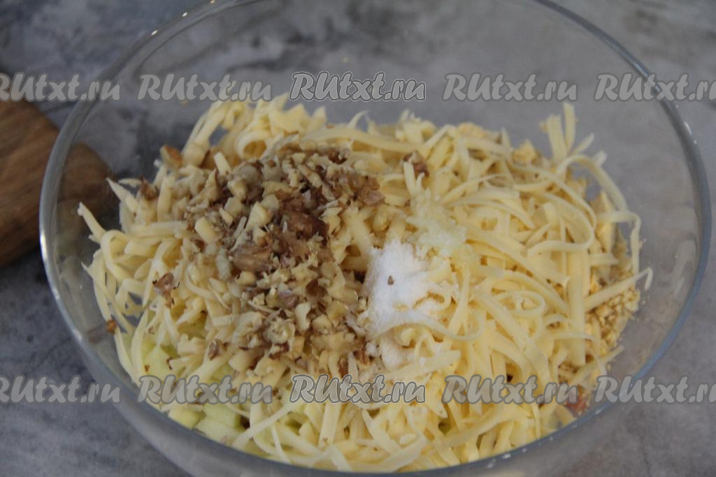 Чеснок почистить и пропустить через пресс. Грецкие орехи порубить ножом. Выложить в салатник сыр, чеснок и орехи. Подсолить содержимое салатника по вкусу.