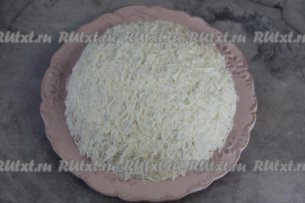 Белки натереть на мелкой тёрке. Аккуратно покрыть салат натёртыми белками.