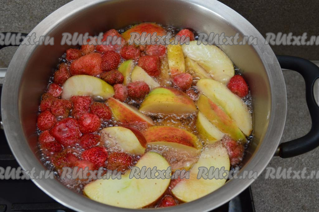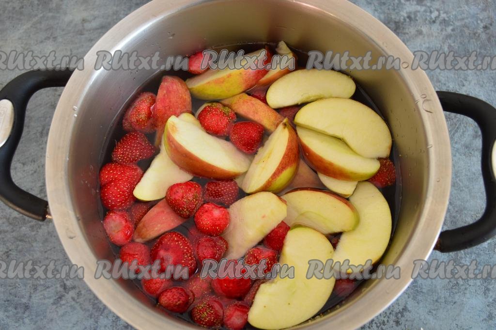 Как только вода закипит, уменьшить огонь до минимума, накрыть кастрюлю крышкой и варить компот из замороженной клубники и яблок 10 минут.