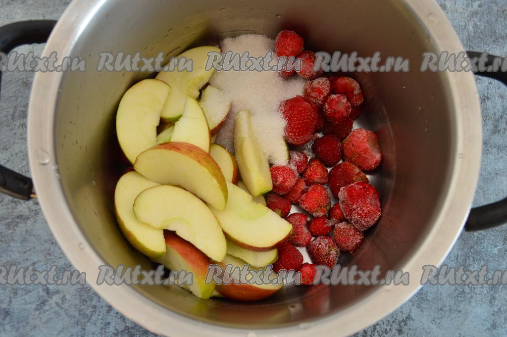 В кастрюлю выложить замороженную клубнику, добавить яблоки, нарезанные на дольки, всыпать сахар.
