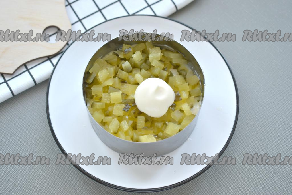 Нарезаем мелко маринованный огурец. 1/3 огурцов выкладываем равномерно поверх яиц, смазываем слегка майонезом.