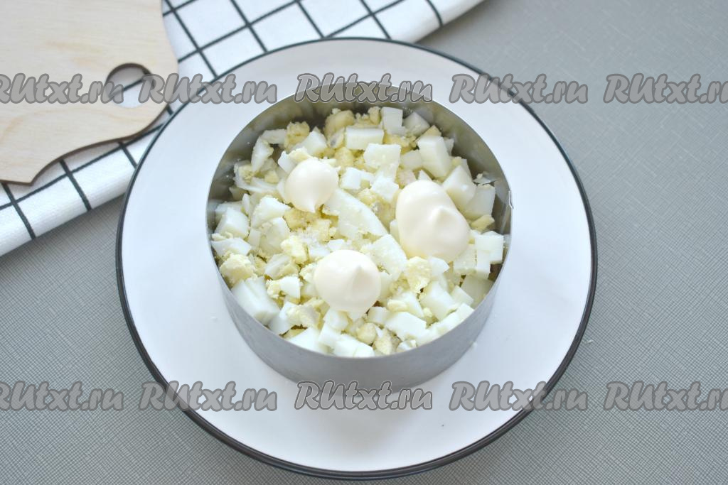 Очищенные яйца нарезаем достаточно мелко. Выкладываем 1/3 яиц следующим слоем салата, смазываем майонезом.
